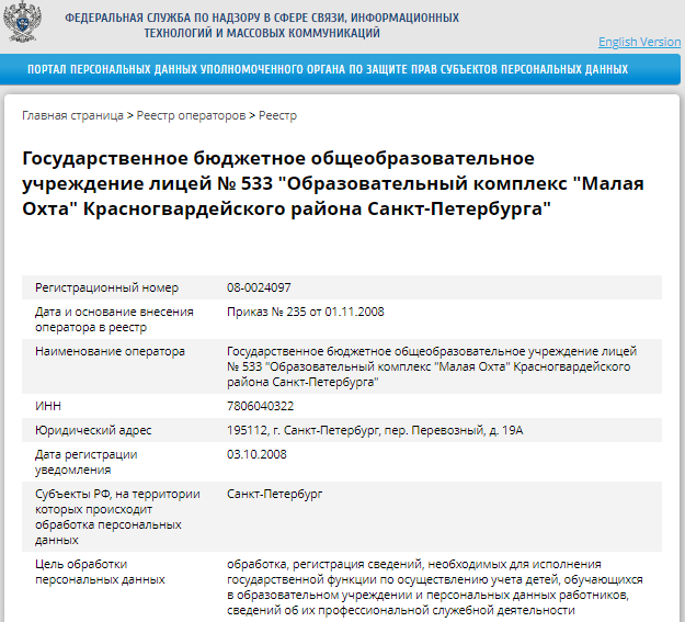 ГБОУ лицей №533 является оператором персональных данных, зарегистрированным Роскомнадзором в реестре операторов, в соответствии с Приказом № 235 от 01.11.2008. Со сведениями, содержащимися в реестре оператора ГБОУ лицей №533 можно познакомиться на сайте: